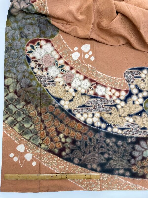 【絵羽柄】の場合、ヒップサイズ96㎝前後で柄付けされているものが多いです。大幅にヒップサイズが大きい方、小さい方の場合は、脇の柄は完全にはつながりませんので雰囲気で感じよく合わせます。