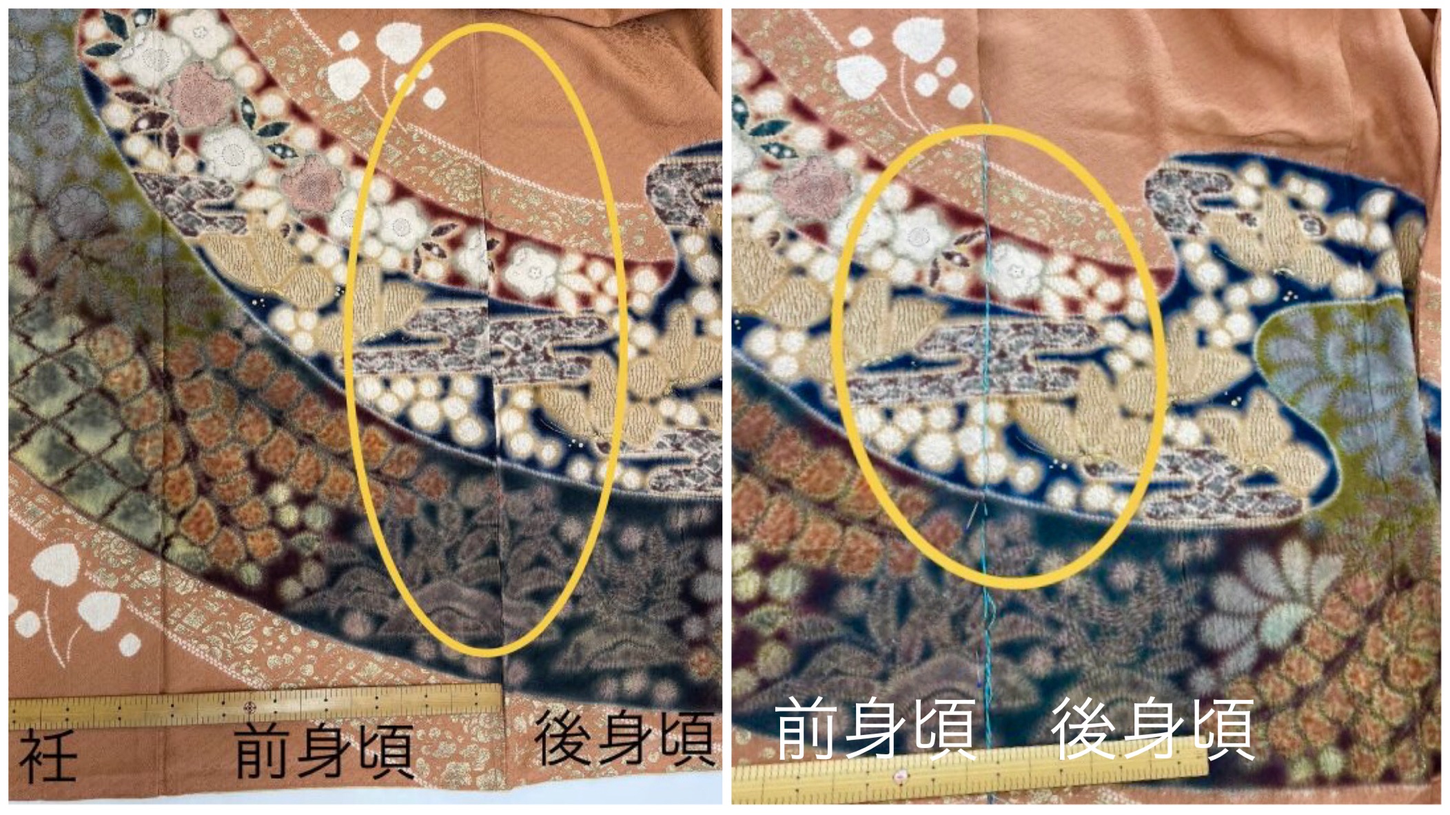 黄色の丸の中を比較していただけるとお直し後は柄が合っているのが分かります。