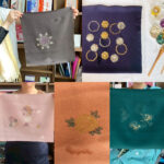 内容は、あらかじめ用意した型紙を使い、着物の端切れに4色の金彩で自由に描くというものです。