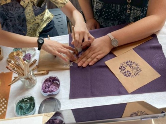 内容は、あらかじめ用意した型紙を使い、着物の端切れに4色の金彩で自由に描くというものです。